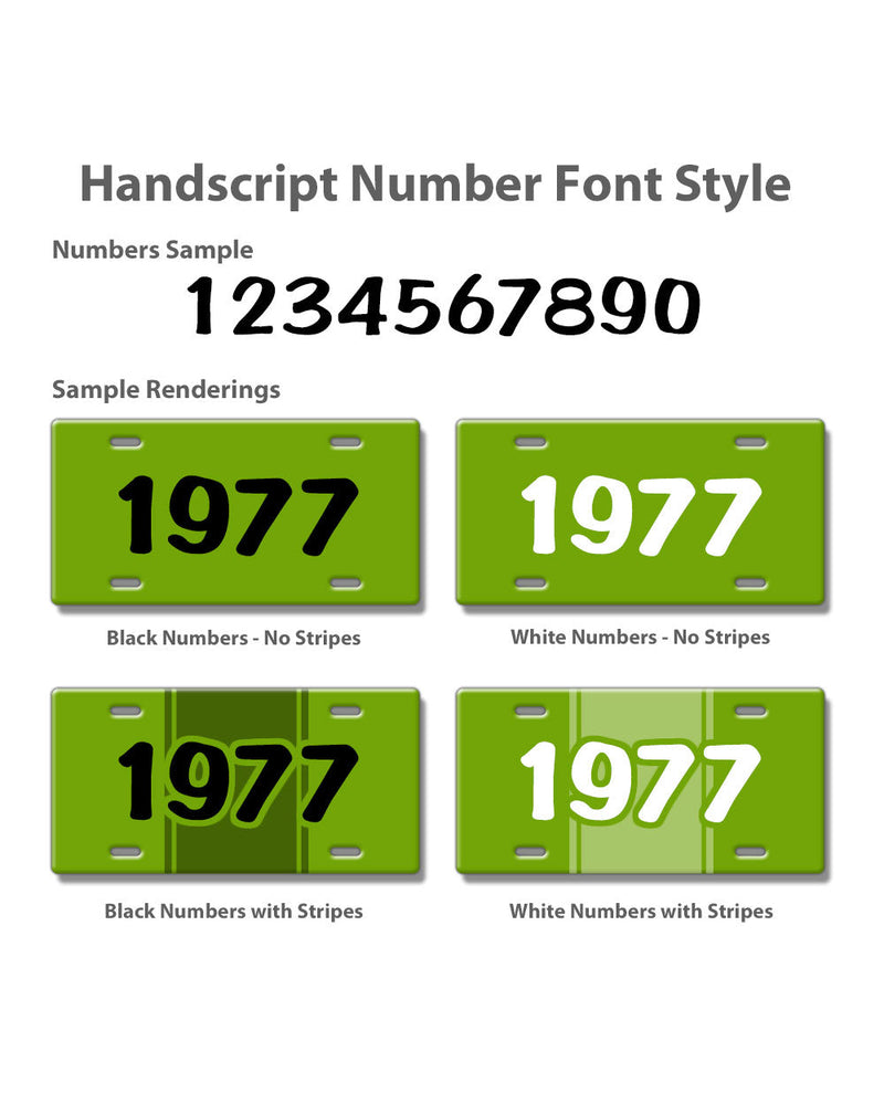 Add style, show the year, and enhance the appearance of your automobile with this novelty license plate. Choose between 15 different colors, 4 font styles, with or without stripes and 2 colors for the fonts and stripes to customize your vehicle to the fullest. This Novelty License Plate can also be used to decorate the walls of your garage, office, workshop, man cave, or anywhere you feel you deserve a special deco spot.